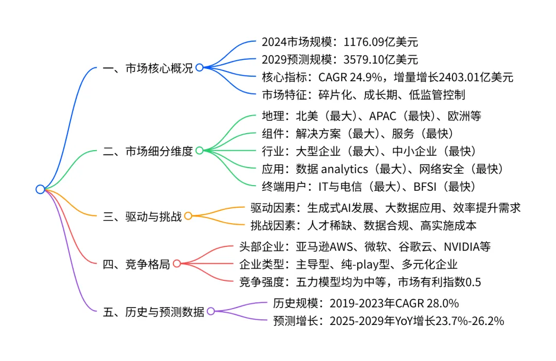 2024-2029 年全球商业人工智能与机器学习市场呈加速增长态势,2024 年市场规模达 1176.09 亿美元,预计 2029 年将增至 3579.10 亿美元,CAGR 为 24.9%,增量增长 2403.01 亿美元;市场呈碎片化结构,驱动力包括生成式 AI 技术突破、大数据普及及企业对运营效率的需求,主要挑战为专业人才稀缺、数据安全合规压力及高实施成本;北美为最大市场(2024 年占比 37.7%),APAC 为增长最快区域(CAGR 28.6%);细分领域中,解决方案(2024 年占比 67.8%)和IT 与电信行业为最大细分市场,网络安全(CAGR 28.4%)和中小企业(CAGR 27.7%)为增长最快细分板块,市场竞争由亚马逊 AWS、微软、谷歌云等科技巨头主导。