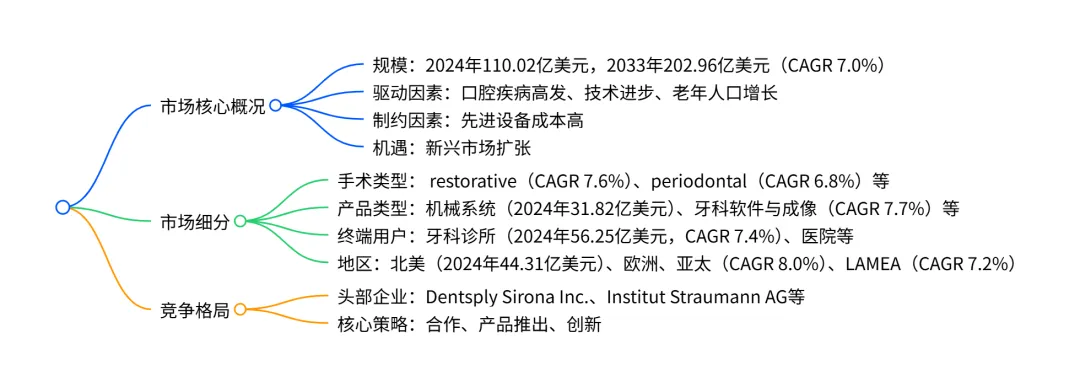 2024-2033 年全球牙科设备市场规模预计从110.02 亿美元增长至202.96 亿美元,CAGR 达 7.0%,核心驱动因素包括口腔疾病患病率上升、牙科设备技术进步及老年人口增长,主要制约因素为先进设备成本较高,而新兴市场扩张是关键增长机遇;市场按手术类型、产品类型、终端用户和地区细分,牙科诊所是最大终端用户,北美为当前最大市场,亚太地区预计增速最快(CAGR 8.0%),头部企业通过合作、产品推出和创新拓展业务。
