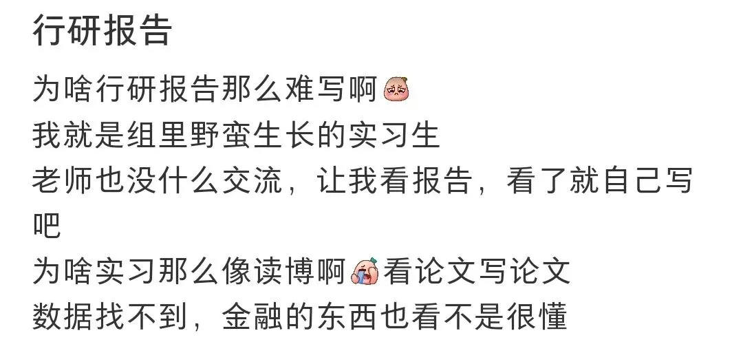 实习生的生活中行研就像吃饭睡觉一样普遍,每个灯火通明的夜晚都是写行研的泪。