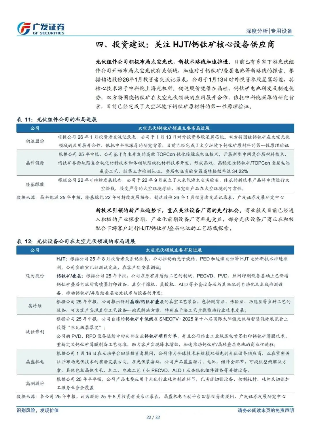 投资建议:聚焦设备环节,推荐HJT/钙钛矿设备商(迈为股份、奥特维、捷佳伟创)、硅片设备商(晶盛机电、高测股份)。