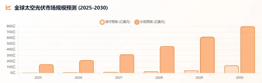 随着可重复使用火箭技术的突破,发射成本从传统的10,000-20,000美元/公斤降至1,500-3,000美元/公斤,预计2025年将进一步降至100美元/公斤以下。而太空光伏具有显著的技术优势:发电效率比地面光伏高7-10倍,年发电小时数可达8,000小时以上,而地面光伏仅为1,000-1,500小时。在商业应用方面,全球太空光伏市场规模预计将从2025年的7.5-150亿美元增长至2030年的13.3-800亿美元,年复合增长率达8.5%-20%。
