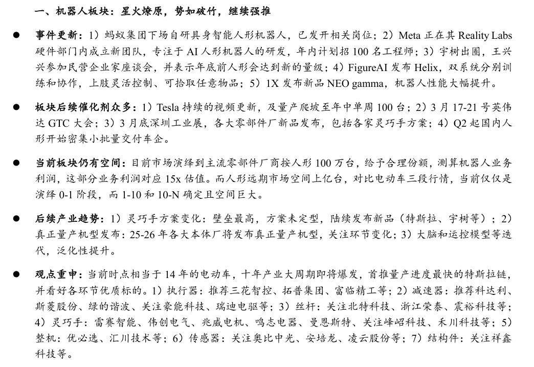 行业催化剂密集,特斯拉预计年中实现单周100台量产爬坡,英伟达 GTC 大会将于3月召开,深圳工业展也将迎来各大零部件厂新品发布。