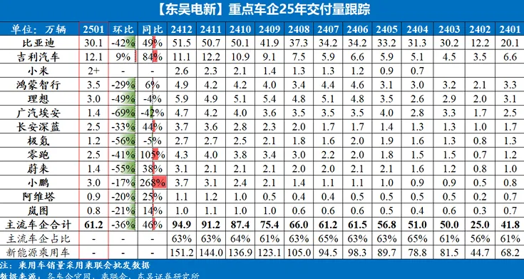 2025年1月,国内电动车销量为94.4万辆,同比+29%,环比-41%,基本符合市场预期。
