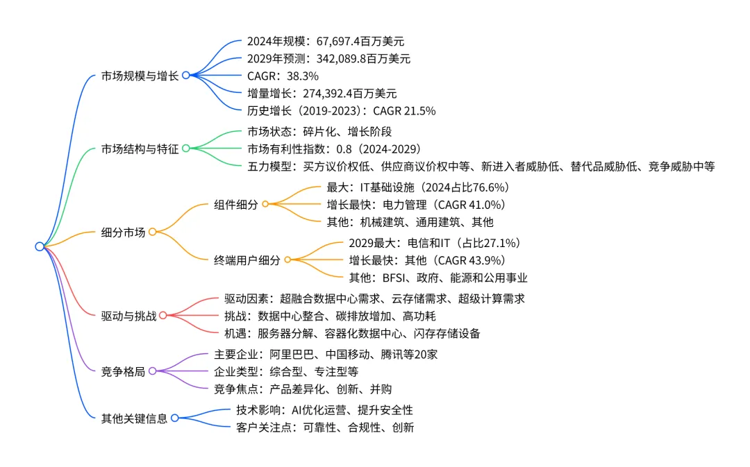 2024-2029 年中国数据中心市场呈高速增长态势,2024年市场规模达67,697.4百万美元,预计2029年将增至342,089.8百万美元,CAGR为38.3%,增量增长达274,392.4百万美元;市场结构呈碎片化,处于增长阶段,IT基础设施是最大组件细分市场(2024年占比76.6%),电信和IT将成为 2029年最大终端用户细分市场(占比27.1%);驱动因素包括超融合数据中心需求上升、云存储需求增长等,面临数据中心整合、碳排放增加等挑战,市场竞争格局中阿里巴巴、中国移动等20家企业为主要参与者,市场有利性指数维持0.8。