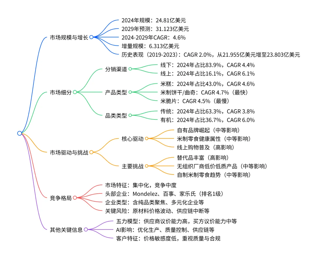 中国包装米制零食市场 2024 年规模达24.81亿美元,2024-2029年将以4.6% 的 CAGR增长至31.123亿美元,增量达6.313亿美元;市场呈集中化格局,线下渠道(2024 年占比 83.9%)仍是主要销售途径,但线上渠道(CAGR 6.1%)和有机品类(CAGR 6.0%)增长最快,米糕是最大产品细分,同时面临替代品竞争、无组织厂商低价冲击等挑战,Calbee、百事等企业主导竞争格局。