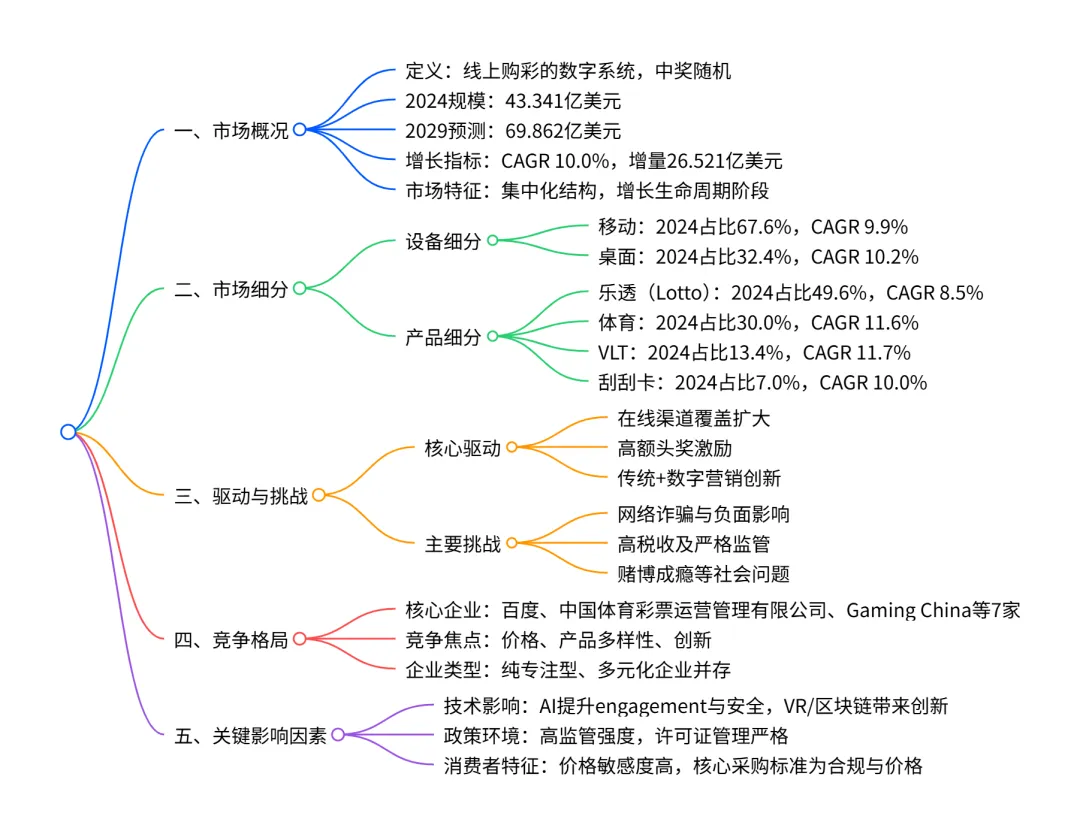 中国在线彩票市场2024年规模达43.341亿美元,2024-2029年将以10.0%的 CAGR加速增长,2029年预计达69.862亿美元,增量增长26.521亿美元;市场呈集中化格局,移动设备是最大细分(2024年占比 67.6%),VLT(视频彩票终端) 是增长最快的产品品类(CAGR 11.7%),百度、中国体育彩票运营管理有限公司等为核心参与者,增长受在线渠道覆盖扩大、高额头奖及营销创新驱动,但同时面临网络诈骗、严格监管和社会问题等挑战,AI、VR 等技术将为市场带来新机遇。