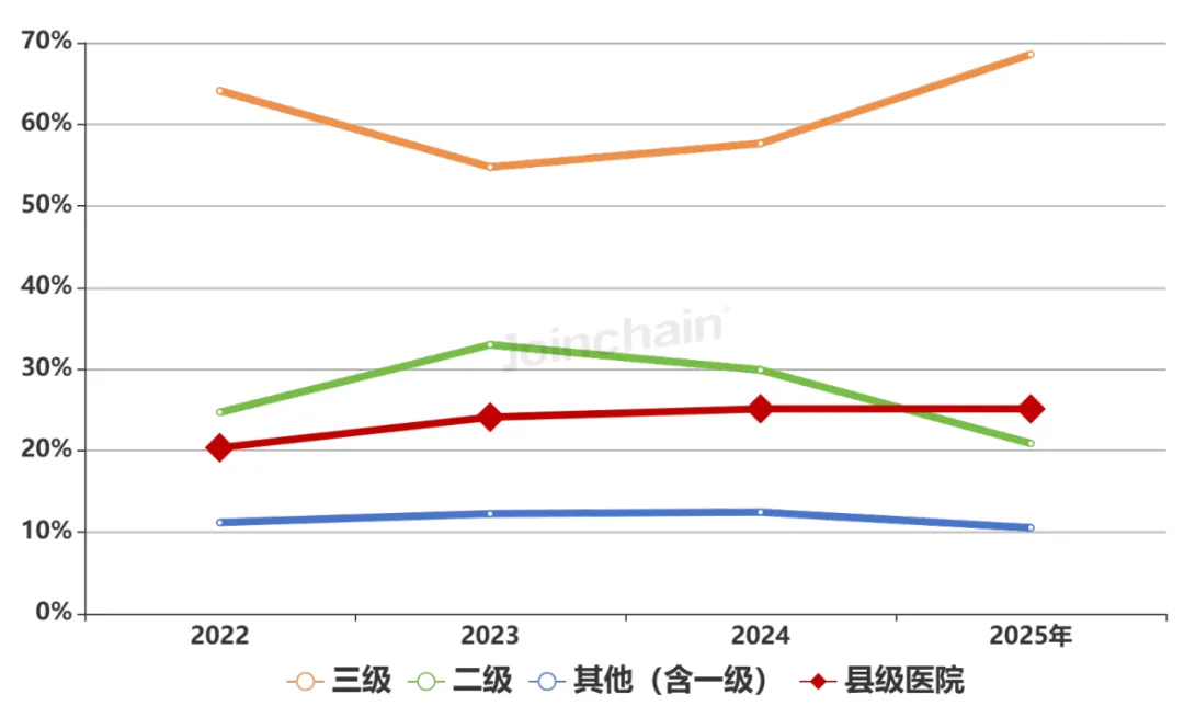 从采购单位类型上看,2025年三级医院、二级医院采购占比分别为68.56%、20.89%;县级医院采购占比为25.11%。各类型采购单位采购占比趋势变化如图表5所示。