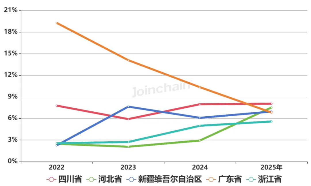 从区域分布看,2025年西部地区采购金额占比最高,为40.42%,其次是东部地区35.31%。省份方面,排名前五的省份有四川省、河北省、新疆维吾尔自治区、广东省、浙江省。
