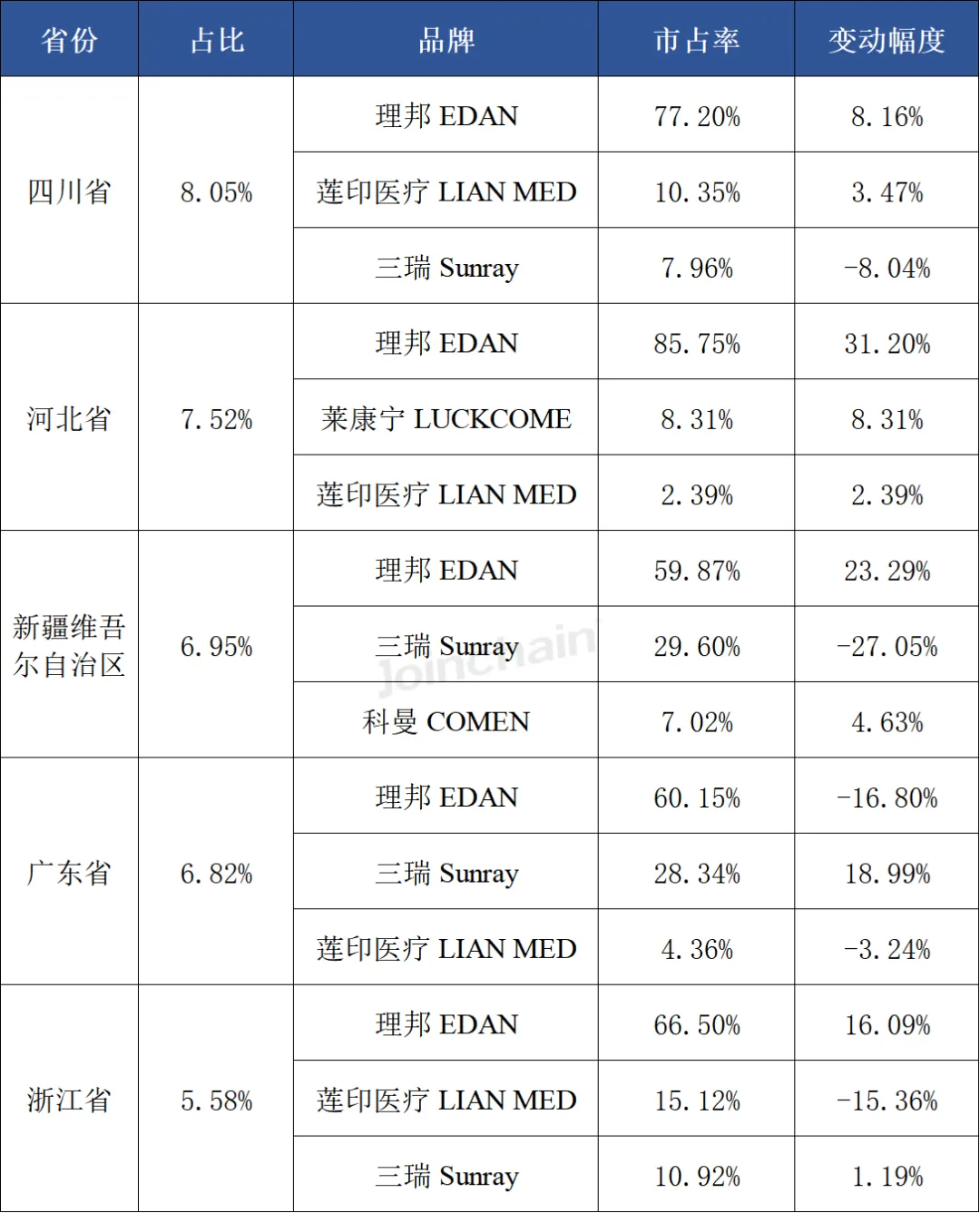 从各省份品牌来看,前五省份的品牌主要以理邦、莲印医疗为主。