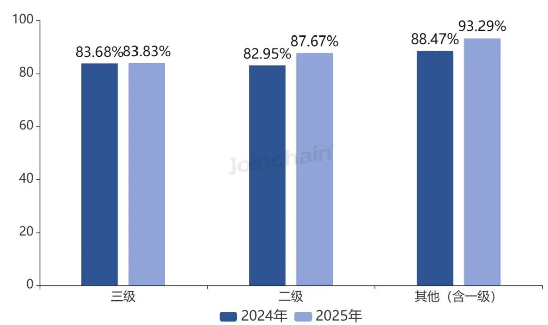 从医院品牌国产化率来看,2025年三级医院本土品牌占比为83.83%,较去年同期上升0.15%;二级医院本土品牌占比为87.67%,较去年同期上升4.72%。