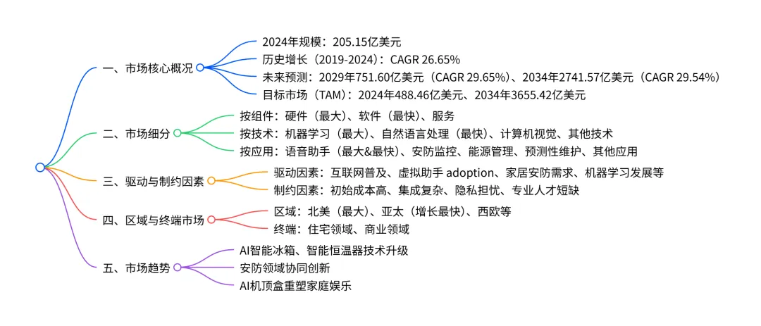 2024 年全球人工智能家庭自动化市场规模达 205.15 亿美元,2019-2024 年复合年增长率 26.65%,预计 2029 年将增至 751.60 亿美元(CAGR 29.65%)、2034 年达 2741.57 亿美元(CAGR 29.54%);市场按组件分为硬件、软件、服务,按技术涵盖机器学习、自然语言处理等,按应用包括语音助手、安防监控等,北美为最大市场、亚太增长最快,核心驱动因素为智能家居设备普及与云计算需求,隐私担忧和专业人才短缺是主要制约因素。