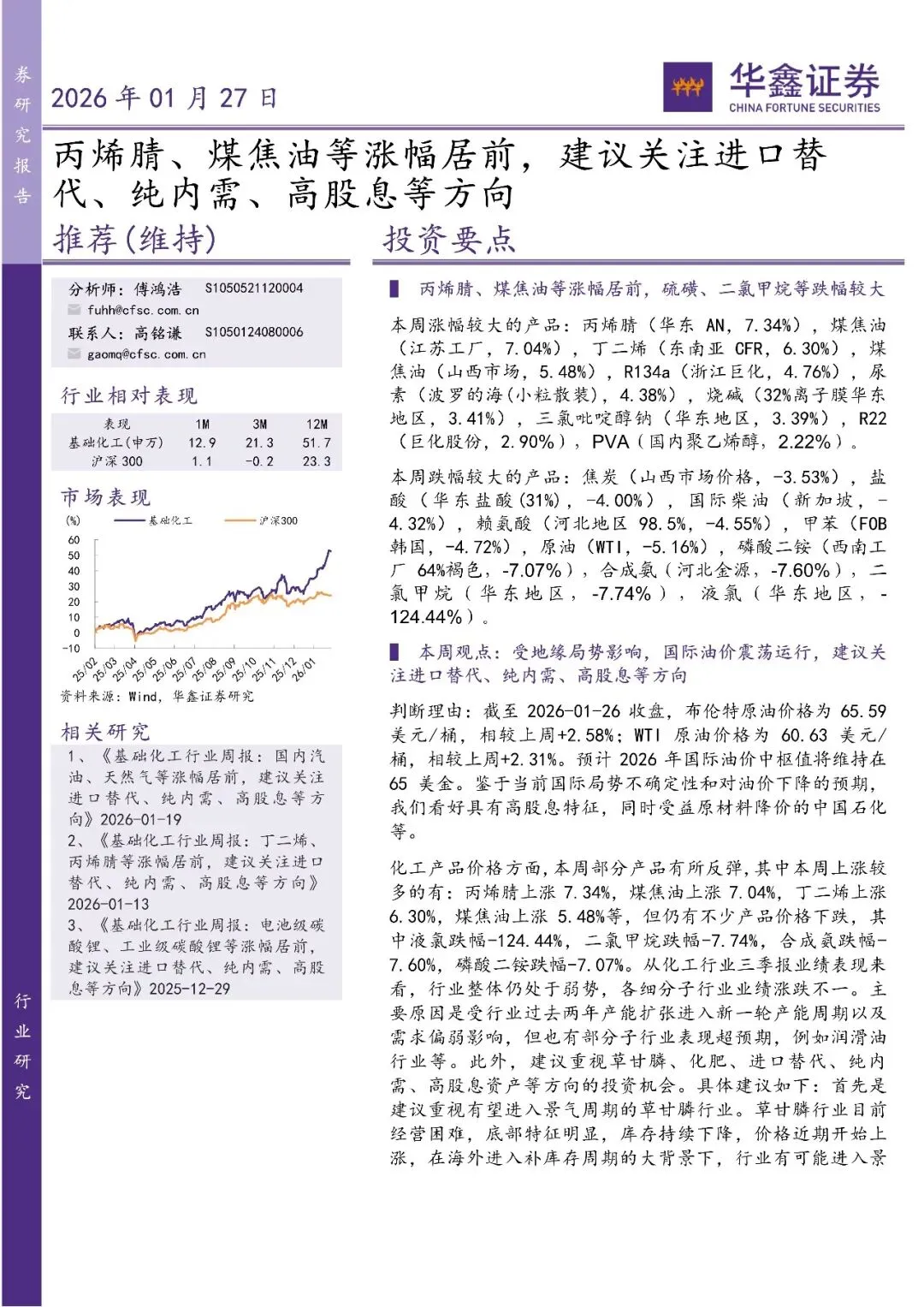当前位置:首页>行业研报>基础化工行业研究:丙烯腈、煤焦油等涨幅居前,建议关注进口替代、纯内需、高股息等方向