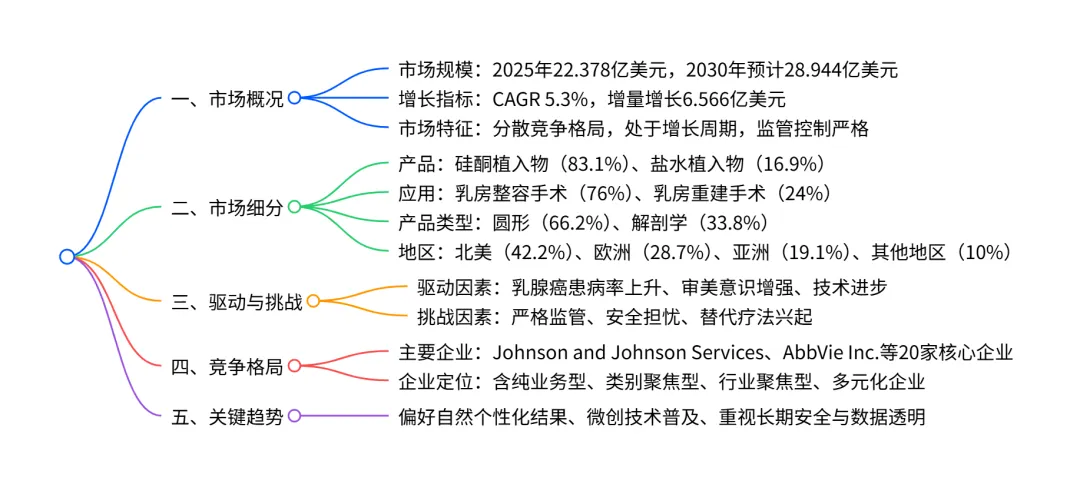 2025-2030 年全球乳房植入物市场呈加速增长态势,2025 年市场规模为 22.378 亿美元,预计 2030 年将达 28.944 亿美元,CAGR 为 5.3%,增量增长 6.566 亿美元;市场以硅酮乳房植入物(2025 年占比 83.1%)、乳房整容手术应用(2025 年占比 76%)、圆形产品类型(2025 年占比 66.2%)和北美地区(2025 年占比 42.2%)为主要细分领域,亚洲是增长最快的地区(CAGR 6.1%),盐水乳房植入物(CAGR 6.2%)、乳房整容手术(CAGR 5.5%)和解剖学产品类型(CAGR 5.7%)为各细分中增长最快的类别;市场驱动因素包括乳腺癌患病率上升、审美意识增强和植入物设计技术进步,面临严格监管、安全担忧和替代疗法兴起等挑战,竞争格局分散,Johnson and Johnson Services、AbbVie Inc. 等为主要参与者。