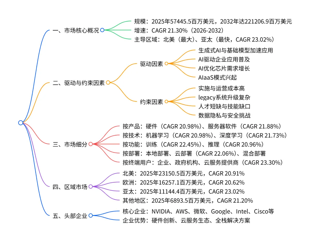 全球 AI 基础设施市场正以21.30% 的 CAGR高速增长,2025 年市场规模约为57445.5 百万美元,预计 2032 年将达221206.9 百万美元;市场受生成式 AI 普及、AI 驱动企业应用激增及 AI 即服务(AIaaS)兴起推动,北美为最大市场(2025 年规模 23150.5 百万美元),亚太地区增长最快(CAGR 23.02%);核心细分领域中,硬件占比最高(2025 年 37792.7 百万美元),深度学习技术增速领先(CAGR 21.73%),企业为主要终端用户;市场面临高成本、人才短缺等挑战,同时绿色数据中心、边缘计算等领域存在显著机遇,头部企业包括 NVIDIA、AWS、微软等。