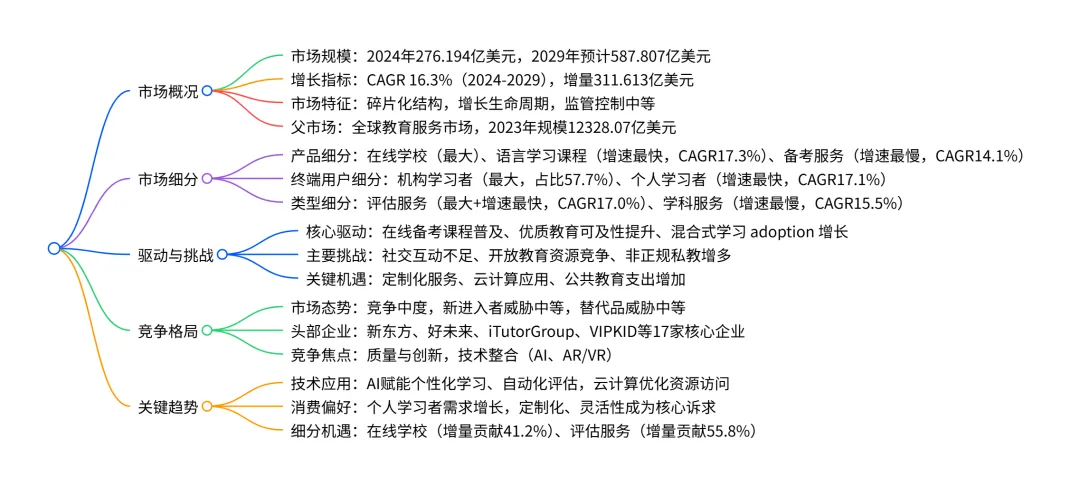 中国K-12在线教育市场处于高速增长阶段,2024 年市场规模达276.194 亿美元,预计2029年将增至587.807亿美元,2024-2029年复合年增长率(CAGR)为16.3%,增量增长达311.613亿美元;市场呈碎片化结构,核心驱动因素包括在线备考课程adoption提升、优质教育可及性改善及混合式学习普及,同时面临学生社交互动不足、开放教育资源竞争等挑战;细分领域中,在线学校是最大产品segment,机构学习者是最大终端用户segment,评估服务是增长最快的类型segment,AI技术应用、定制化服务及云计算普及成为市场关键机遇,头部企业包括新东方、好未来等。