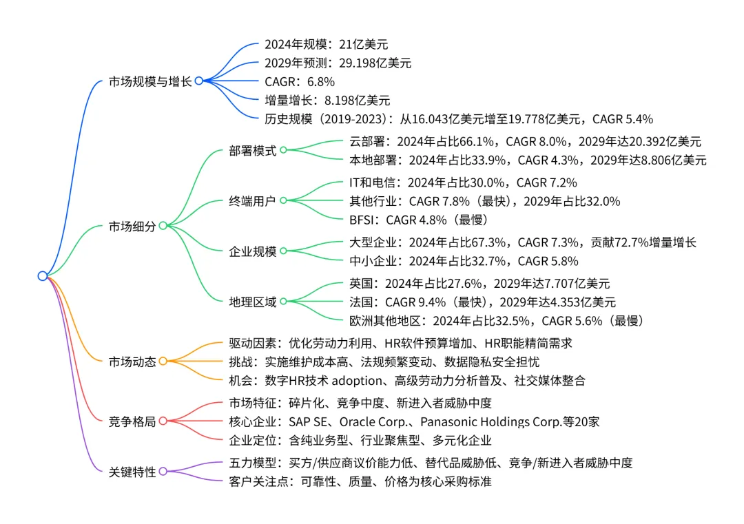 2024-2029年,欧洲劳动力管理软件市场呈加速增长态势,2024年市场规模为21亿美元,预计 2029 年达29.198亿美元,CAGR为6.8%,增量增长8.198 亿美元;市场呈碎片化特征,云部署(占 2024 年市场份额 66.1%,CAGR 8.0%)、大型企业(占 2024年市场份额67.3%,CAGR7.3%)、IT 和电信行业(占 2024 年市场份额 30.0%,CAGR 7.2%)及英国(占 2024 年市场份额 27.6%)为核心增长板块,法国(CAGR 9.4%)是增速最快地区;市场驱动因素包括 HR 软件预算增加、HR 职能优化需求等,同时面临实施维护成本高、数据安全等挑战,竞争格局以 SAP SE、Oracle Corp. 等企业为主,买方与供应商议价能力均较低。