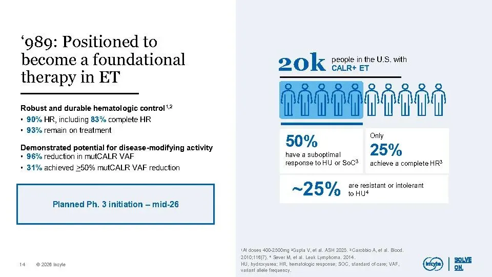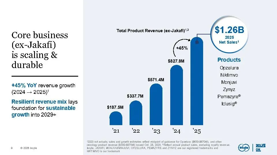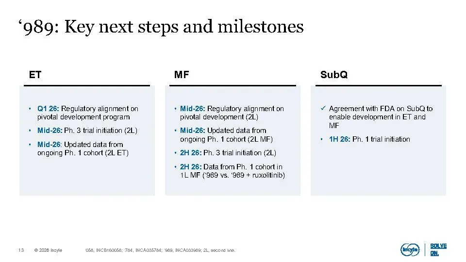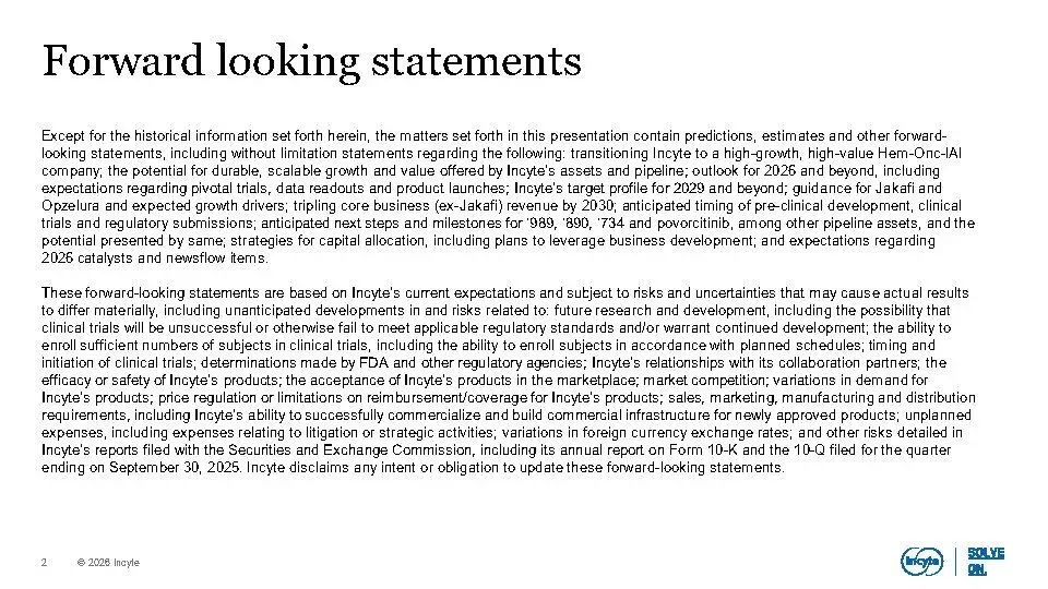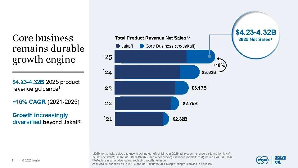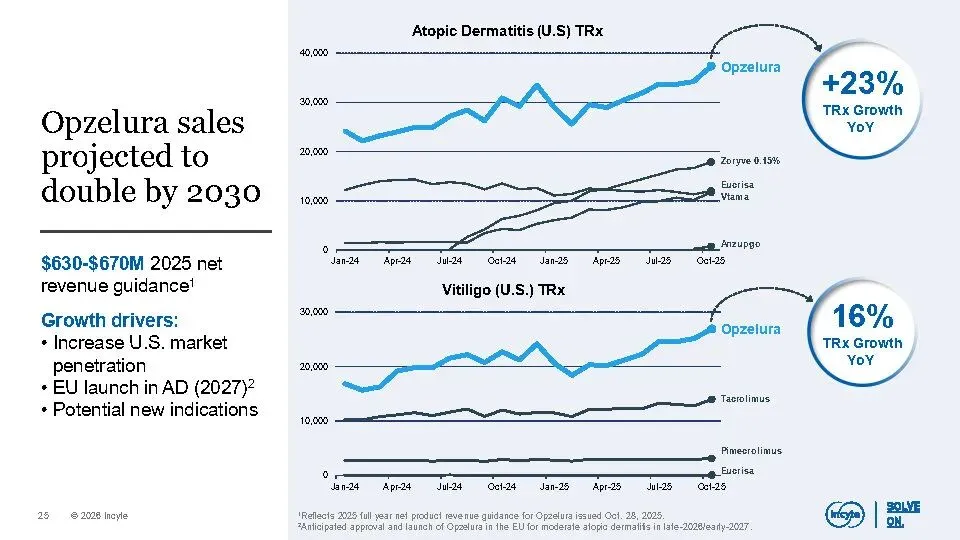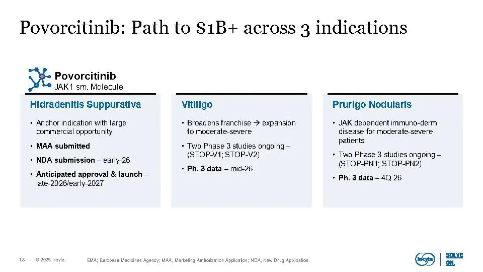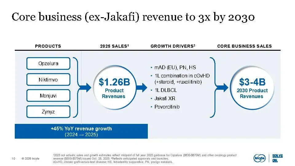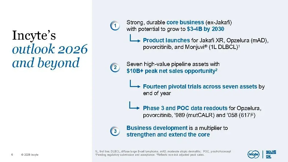公司核心业务(不含Jakafi)在2025年已实现增长,预计到2030年将扩大到30–40亿美元规模,主要由Opzelura、Monjuvi、Niktimvo、Jakafi XR及povorcitinib等产品驱动。同时,晚期管线包含7个高潜力资产,覆盖多个未满足需求的重大疾病,合计峰值销售潜力超100亿美元,其中6项已进入III期临床。