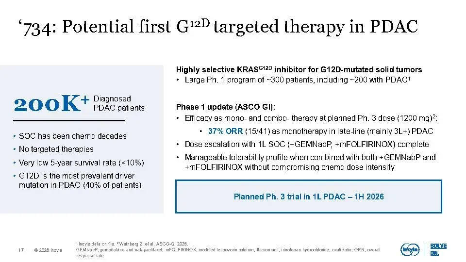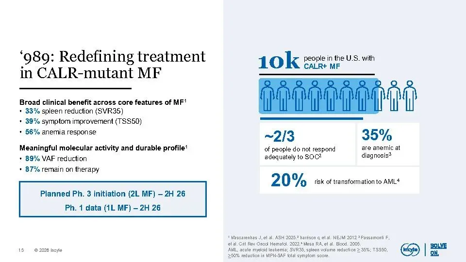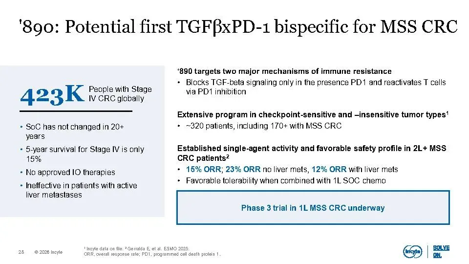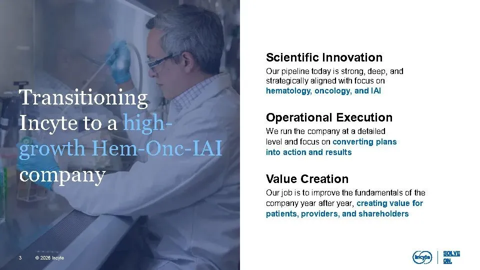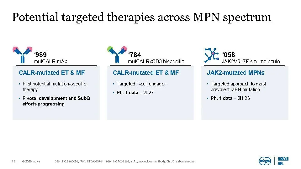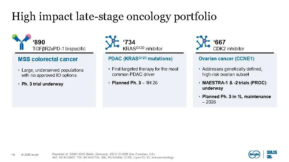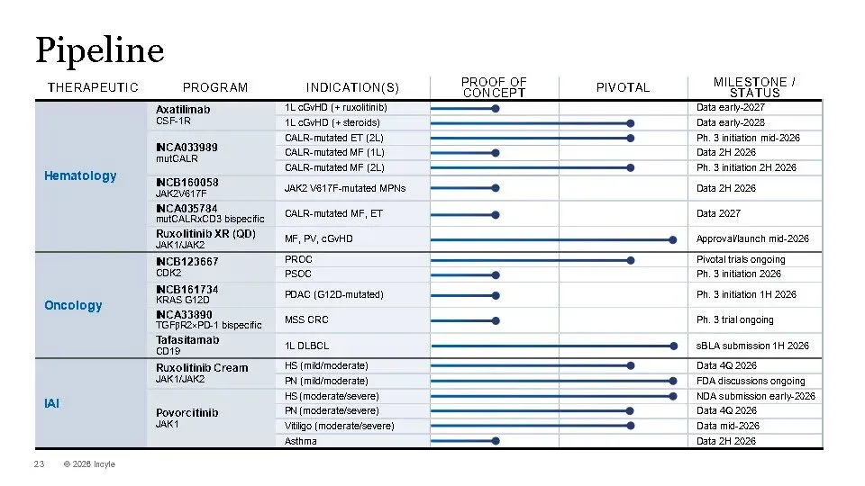 Incyte正加速转型为一家高增长、高价值的血液肿瘤-实体瘤-免疫炎症(Hem-Onc-IAI)公司。核心驱动力来自三大聚焦领域:血液学(如MPN靶向治疗)、肿瘤学(如KRAS G12D抑制剂、TGFβ×PD-1双抗)和免疫与炎症(以JAK通路为核心的皮肤病管线)。
