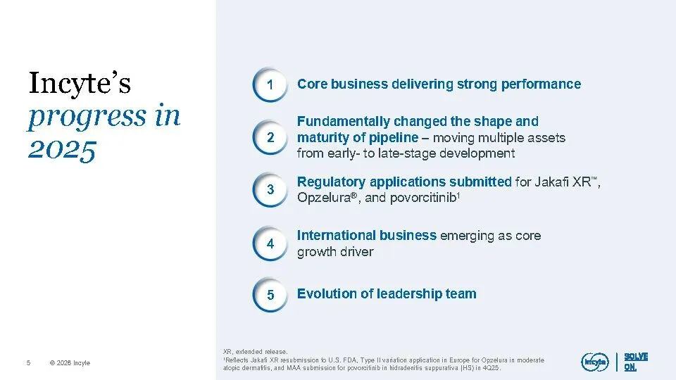 2026年是关键年,公司将迎来多项监管提交、III期数据读出及潜在产品上市(Jakafi XR、povorcitinib),并持续推进业务拓展以强化核心平台。整体战略目标是在2029年后成为具备15–20%五年复合增长率、多元化收入结构、强劲现金流和低专利悬崖风险的顶级生物制药企业。