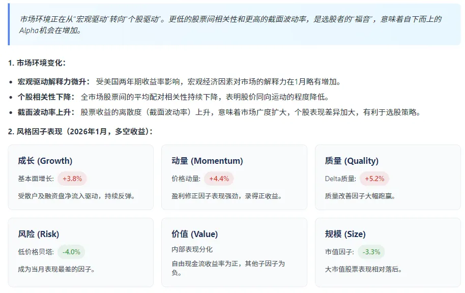货币层面,2026年预计有1-2次政策利率下调(幅度10-20bp)及存款准备金率下调(25-50bp),信贷增速维持在7.8%的温和水平。财政赤字率稳定在4%,但广义财政赤字可能扩大0.5-1个百分点,重点投向保障性住房、设备更新等领域。报告特别强调,地方政府债务化解已安排6万亿元置换额度,若拖欠企业账款问题加速解决,将显著改善现金流环境。A股投资策略:量化因子揭示alpha机会
