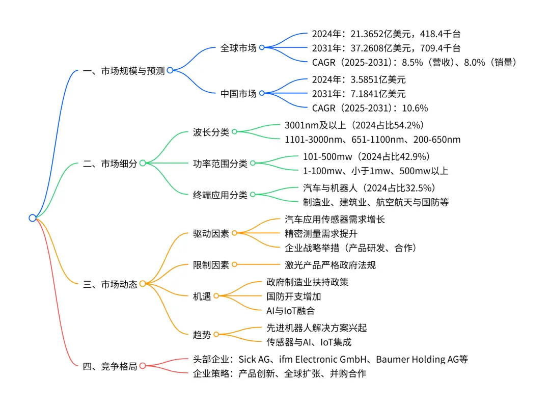 2021-2031年,全球激光距离传感器市场呈现稳健增长态势,2024 年市场规模达 21.3652 亿美元,预计 2031 年增至 37.2608 亿美元,CAGR 为 8.5%;中国市场增速更快,2024 年规模 3.5851 亿美元,2031 年将达 7.1841 亿美元,CAGR 达 10.6%。市场核心驱动因素包括汽车应用传感器需求增长、精密测量需求提升及企业战略举措,主要限制为激光产品相关严格法规,而政府制造业扶持、国防开支增加及 AI 与 IoT 融合带来重要机遇;产品方面,3001nm 及以上波长和101-500mw 功率范围占比最高,汽车与机器人领域为最大终端应用市场,头部企业包括 Sick AG、ifm Electronic GmbH 等,行业未来将向先进机器人、技术融合方向发展。