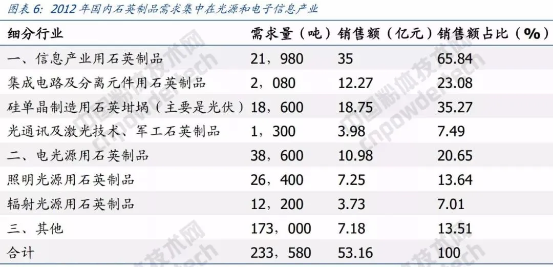 从需求结构来看,2012年电子信息产业整体占比66%,其中集成电路及分离元件占比23%、光纤及军工占比7.5%、硅单晶石英坩埚占比35%。国内石英需求结构在向光纤半导体等高端领域调整。