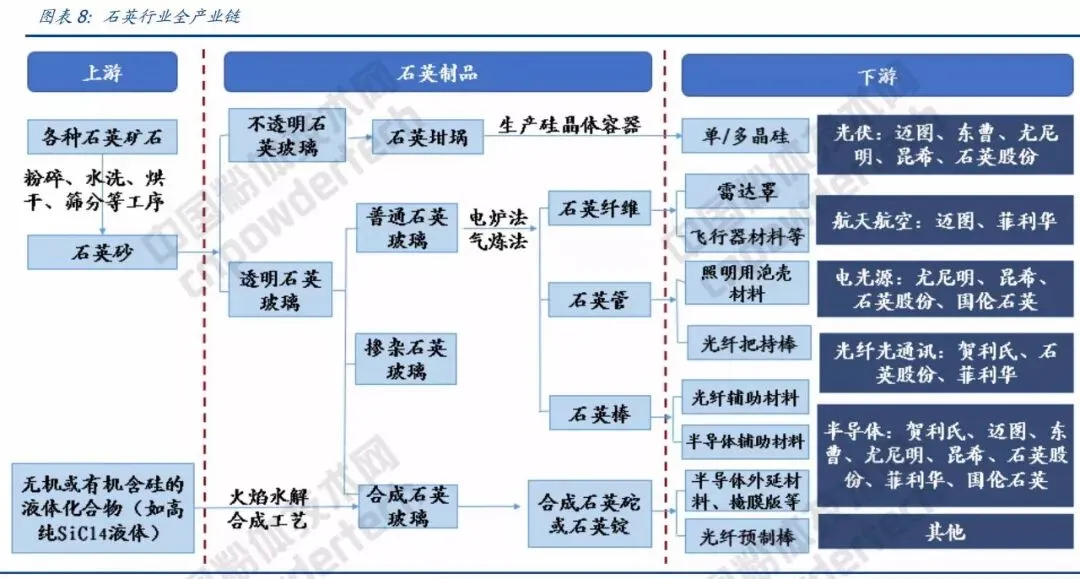 石英是国家战略性产业和支柱性产业发展进步过程中不可替代的基础材料。下游从中低端的光源行业向高端领域迈进,逐渐广泛应用于光纤通信、半导体、光伏、新型电光源、冶金、化工、微电子、仪表、激光、核科学、天文学、航空航天以及国防军工等高科技领域。
