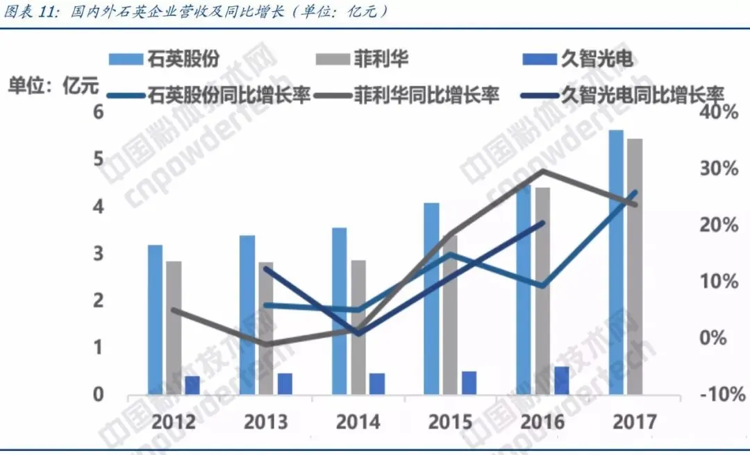 石英股份与菲利华在国内处于绝对龙头地位。国内石英行业中目前仅石英股份、菲利华在A股上市,两家公司2017年收入分别达到5.63亿和5.45亿,另外久智光电是A股上市公司鑫茂科技的控股子公司,亿仕达、凯德石英、路德石英三家企业在新三板挂牌,规模较小,除亿仕达2016年收入突破1亿元,其他三家均在千万规模,另外行业内还有众多更小规模的生产中低端产品的企业。