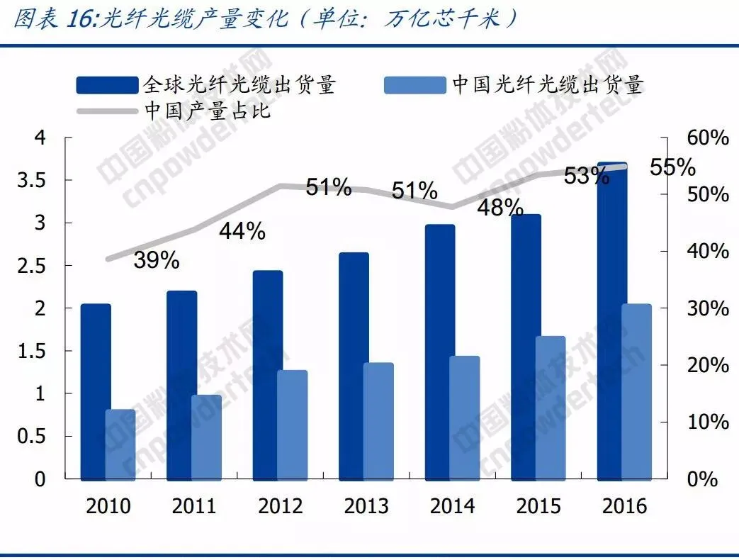 CRU数据显示,2007年到2016年,中国光纤需求总量增长了6.5倍,达到了2.43亿芯公里。2017年三大运营商集采加快,国内光纤光缆需求量约为2.9亿芯公里,光纤光缆需求持续旺盛。根据前瞻产业研究院估计,2018年国内光纤需求有望达到3.5亿芯公里。