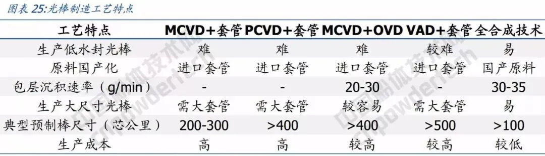 光棒的核心材料:芯棒+石英套管。早期光棒制造技术采用一步法。为了提高单根预制棒的可拉纤长度以提高生产效率,经过三十年的发展,最终确定了两步法的工艺路线,即先制造芯棒,然后在芯棒外采用不同技术制造外包层套管。