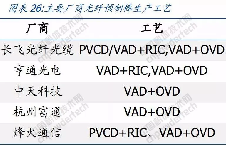 芯棒制造工艺主要有VAD、OVD、MCVD和PCVD(具体的光棒制造过程中多采用组合工艺),外包技术主要有火焰水解法(合成法、SOOT法)、套管法、等离子喷涂法等。一般而言,芯棒的制造决定了光纤的传输性能,而外包层则决定光纤的制造成本和产量。作为光纤预制棒的核心材料,芯棒和套管对材料纯度的要求非常高,由于严重依赖进口,直接制约光棒扩产进度。芯棒采用四氯化硅水解合成法,目前全依赖进口。套管90%依赖进口,国内久智科技小批量供货,目前石英股份正在研发进程中,国产替代需求强烈。