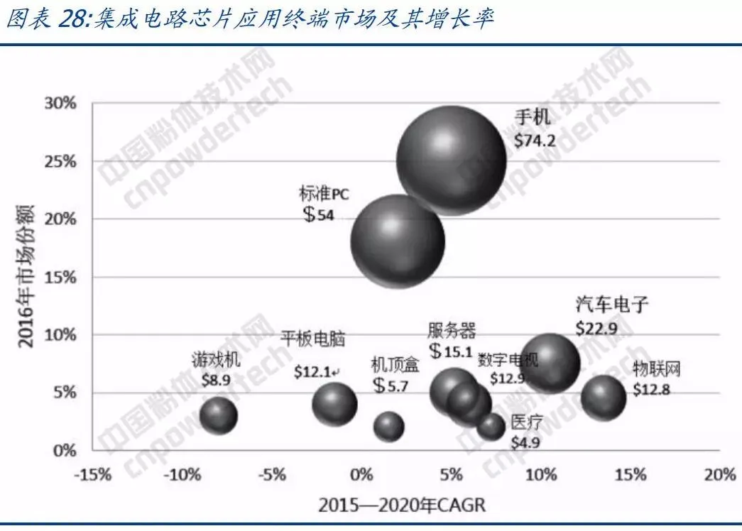 未来存储器、汽车电子和工业用半导体芯片是带动半导体市场成长的最直接因素,5G网络、NB-IoT也将积极推动半导体产业步入黄金期。而PC和智能手机等传统半导体市场的增长将持续放缓。物联网将成为发展最快的领域,2015~2020年CAGR高达13.3%,IC整体市场的增长率约为4.9%。