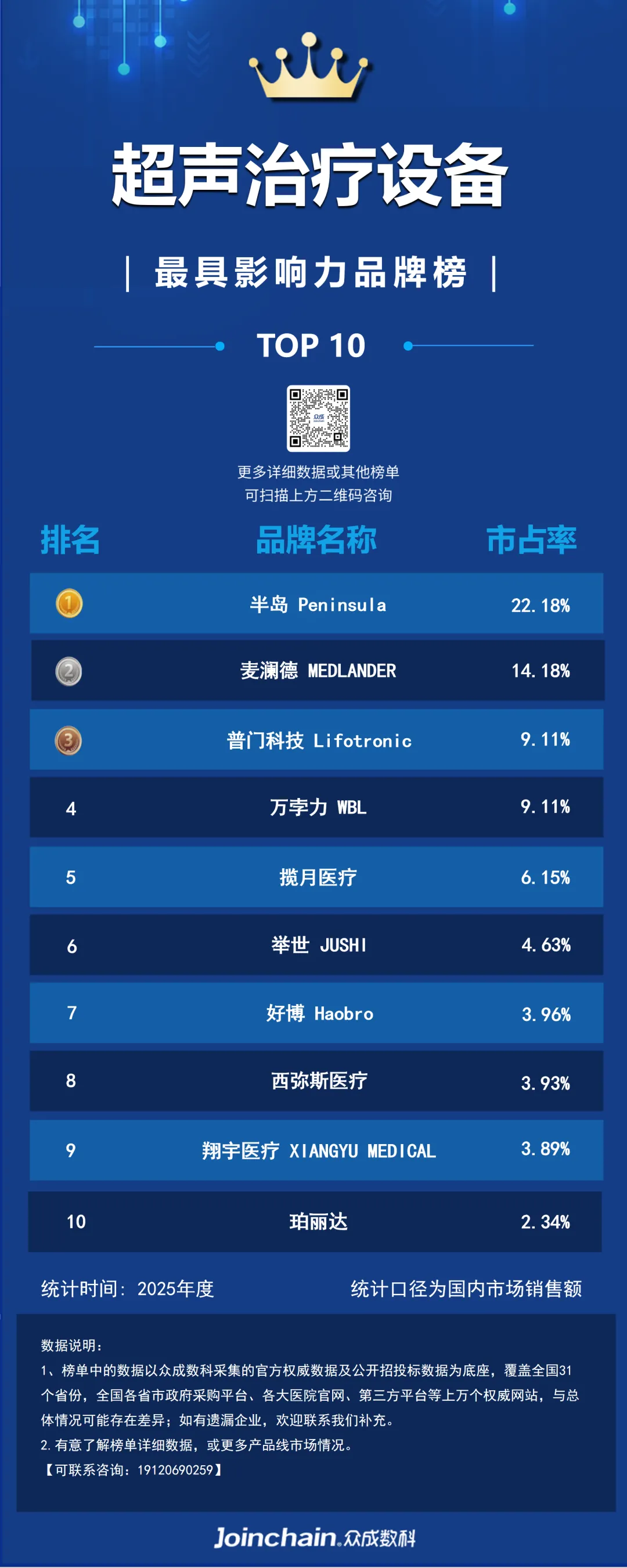 据众成数科医械云标讯MDBIDS统计分析,2025年中国超声治疗设备排名前三的品牌为半岛(22.18%)、麦澜德(14.18%)、普门科技(9.11%)。