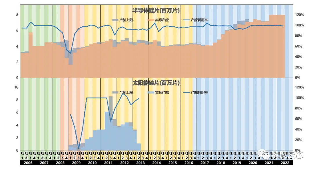 *注:由于披露问题,2017年2季度以后缺乏硅晶圆产能的片数数据,但披露了金额数据,故上图为通过金额数据推算的结果,可能存在一定误差,仅做趋势参考。