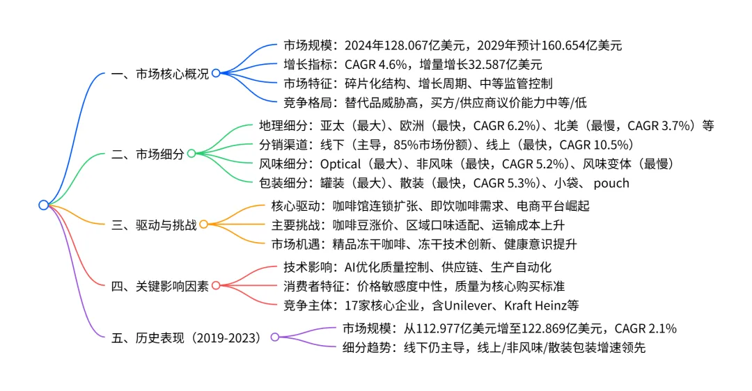 2024-2029年全球冻干咖啡市场呈现稳步增长态势,2024年市场规模达 128.067亿美元,预计2029年将增至160.654亿美元,年复合增长率(CAGR)为4.6%,增量增长32.587亿美元;市场结构呈碎片化,行业处于增长周期,替代品威胁高是主要竞争特征;地理上亚太地区为最大市场,欧洲是增长最快区域;分销渠道中线下占主导但线上增速领先(CAGR 10.5%);产品方面,Optical 风味和罐装包装分别是对应细分领域的最大 segment,非风味产品和散装包装增长最快;市场驱动因素包括全球咖啡馆连锁扩张、即饮咖啡需求上升等,同时面临咖啡豆价格上涨等挑战,AI 技术在生产、供应链等环节的应用为市场带来新机遇。