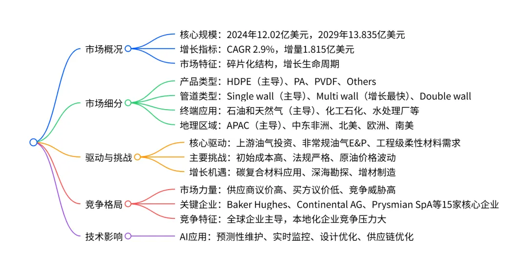 2024-2029年全球柔性管道市场呈现稳健增长态势,2024年市场规模达 12.02亿美元,预计2029年将增至13.835亿美元,年复合增长率(CAGR)为 2.9%,增量增长1.815亿美元;市场结构呈碎片化,供应商议价能力高、买方议价能力低、竞争威胁高,APAC(亚太地区) 是最大且增长最快的区域市场(CAGR 3.6%),HDPE(高密度聚乙烯) 为核心产品类型(2024 年市场份额 76.8%),石油和天然气行业是最大终端应用领域(2024 年市场份额 51.9%);增长主要受上游油气投资增加、非常规油气勘探开发推进等因素驱动,但面临初始成本高、法规严格等挑战,AI 技术应用和深海勘探需求为主要增长机遇。