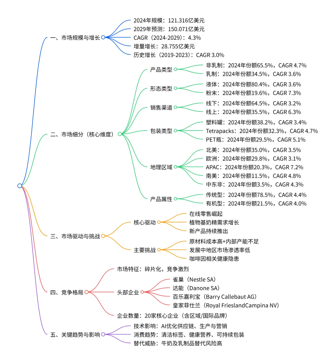2024-2029 年全球咖啡奶精市场呈现稳步增长态势,2024 年市场规模达121.316 亿美元,预计 2029 年将增至150.071 亿美元,期间复合年增长率(CAGR)为4.3%,增量增长达28.755 亿美元;市场结构呈碎片化特征,非乳制奶精(2024 年市场份额 65.5%)、液体型奶精(2024 年市场份额 80.4%)、线下渠道(2024 年市场份额 64.5%)和北美地区(2024 年市场份额 35.0%)为当前主要细分领域,而粉末型奶精(CAGR 7.3%)、在线渠道(CAGR 6.3%)、APAC 地区(CAGR 7.2%)为增长最快细分;市场增长主要受在线零售兴起、植物基奶精需求增长和新产品推出驱动,但面临原材料成本高、市场渗透率低和咖啡因健康隐患等挑战,竞争格局以雀巢(Nestle SA)、达能(Danone SA)等国际企业为主,行业整体受 AI 技术应用和清洁标签趋势进一步影响。