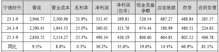 营收情况:宁德时代前三季度营收2830.72亿元,同比增长9.3%,毛利率25.3%,同比增加0.3百分点,净利润达到490.34亿元,净利润(扣非)436.19亿元,同比增长35.6%;应收账款、存货和合同负债均有不同幅度的增长,其中合同负债余额为406.78亿元,下游订单较多。