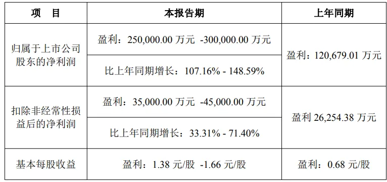 净利润25-30亿元,同比增长107.16%-148.59%。净利润【扣非】3.5-4.5亿元,同比增长33.31%-71.40%。参考三季度情况,净利润【扣非】0.85亿元,四季度净利润【扣非】大幅度增长。