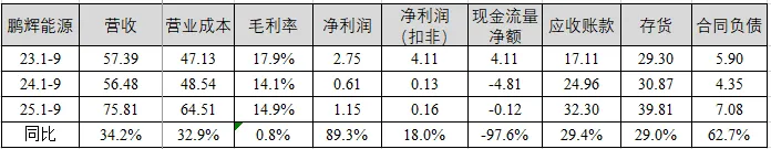 营收情况:鹏辉能源前三季度营收75.81亿元,同比增长34.2%,毛利率14.9%,同比增加0.8百分点,净利润1.15亿元,净利润(扣非)0.16亿元,同比增长18.0%;