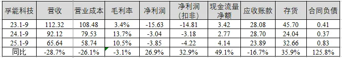 营收情况:孚能科技前三季度营收65.64亿元,同比下降28.7%,毛利率10.5%,同比下降3.1百分点,净利润亏损3.85亿元,净利润(扣非)亏损4.22亿元,同比增加32.9%;应收账款同比下降16.7%;存货同比增长35.9%,合同负债余额为0.83亿元。