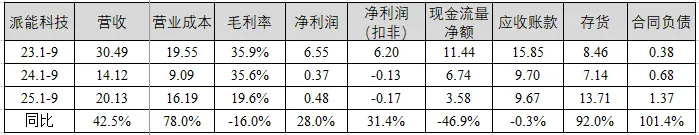 营收情况:派能科技前三季度营收20.13亿元,同比增长42.5%,毛利率19.6%,同比下降16个百分点,净利润0.48亿元,净利润(扣非)亏损0.17亿元,同比增长;应收账款同比下降0.3%;存货同比增长92.0%,合同负债余额为1.37亿元;