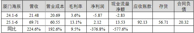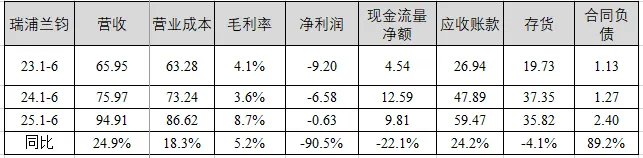 营收情况:瑞浦兰钧上半年营收94.91亿元,同比增长24.9%,毛利率8.7%,同比增加5.2个百分点,净利润亏损0.63亿元,同比大幅度减亏;应收账款同比增长24.2%;存货同比减少4.1%;合同负债余额为2.40亿元;现金流量净额为9.81亿元。