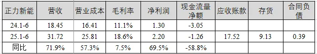 营收情况:正力新能上半年营收31.72亿元,同比增长71.9%,毛利率18.6%,同比增加7.5个百分点,净利润2.20亿元,同比增长69.5%。