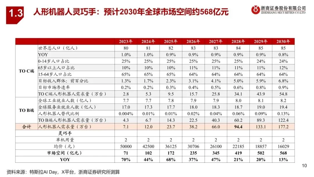 灵巧手:人形机器人末端执行与感知的工具,是人形机器人未来硬件迭代空间最大的功能模块之一。灵巧手模仿人手的结构和功能,实现对物体的灵活抓取,满足多种工作需求。根据我们测算,目前单只人形机器人灵巧手成本约2.8万元,我们预计产业化成熟后,单只价值量有望降低到1.5万元,在人形机器人整机成本中占比约14%。我们预计2030年人形机器人灵巧手全球市场空间约568亿元,2023-2030年市场空间复合增速约35%。