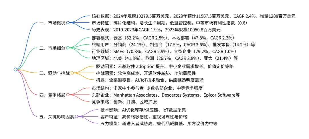 2024-2029年全球分销软件市场呈现稳步增长态势,2024 年市场规模达 1027950万美元,预计2029年将增至1156750万美元,CAGR 为2.4%,增量增长128800万美元;市场结构呈碎片化,云部署(占2024年市场份额 52.2%,CAGR 2.5%)、中小企业(SMEs)(占 2024 年市场份额 70.8%,CAGR 2.9%)、分销商(占 2024 年市场份额 24.1%)为核心细分领域,北美(占 2024 年市场份额 41.8%)是最大区域市场,欧洲(CAGR 2.8%)为增长最快区域;驱动因素包括云基软件 adoption 提升、中小企业需求增加等,同时面临软件高成本、开源软件竞争等挑战,市场竞争格局以多家中小参与者为主,头部企业通过创新和并购巩固地位。
