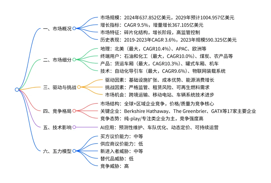 2024-2029年全球铁路车辆租赁市场呈现强劲增长态势,2024年市场规模达637.852亿美元,预计 2029 年将增至1004.957亿美元,期间复合年增长率(CAGR)为9.5%,增量增长达367.105亿美元;市场呈碎片化结构,北美是最大且增长最快的地区(CAGR 10.4%),石油和化工是最大终端用户 segment(2029 年市场份额 58.3%),货运车厢是最主要产品类型(CAGR 10.3%),自动化导引车是主导技术 segment(贡献 59.1% 增量增长);市场增长主要受铁路基础设施扩张、铁路车辆租赁的成本优势及全球原油和能源消费增长驱动,但面临严格监管、租赁相关风险及可再生燃料需求上升的挑战,AI 技术在预测性维护、车队优化等领域的应用正重塑市场。