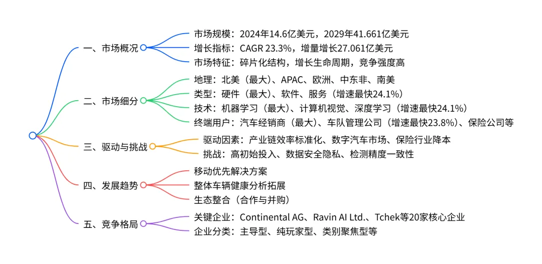 全球AI车辆检测系统市场在2024年规模达14.6亿美元,预计2029年将增长至41.661亿美元,CAGR 达23.3%,增量增长27.061亿美元;市场呈碎片化竞争格局,北美为最大区域市场(2029 年占比 36.7%),硬件是最大类型细分(2024 年占比 40.2%),机器学习是核心技术(2024 年占比 29.0%),汽车经销商为主要终端用户(2024 年占比 30.2%);驱动因素包括汽车产业链效率提升需求、数字汽车市场兴起及保险行业降本诉求,同时面临高初始投入、数据安全及检测精度一致性等挑战,移动优先解决方案和 IaaS 模式成为主要发展趋势。