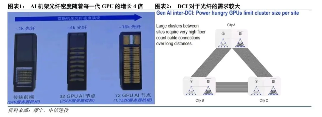 关键数据:AI机架光纤密度随GPU代际升级呈4倍增长(传统前端1k光纤 → 72 GPU AI节点16k光纤)