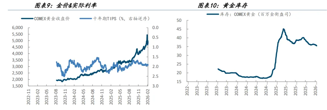 黄金高景气维持,贵金属进入去杠杆的高波动状态,沃什大概率没有市场想的这么鹰 派,黄金的支撑在央行购金和降息下更强。本周COMEX金价+6.57%至4988.6美元/盎司,美债10年期TIPS下降0.06个百分点至1.88%。SPDR黄金持仓减少10.87吨至1076.23吨。本周黄金受地缘政治风险影响,市场整体呈现强势震荡格局